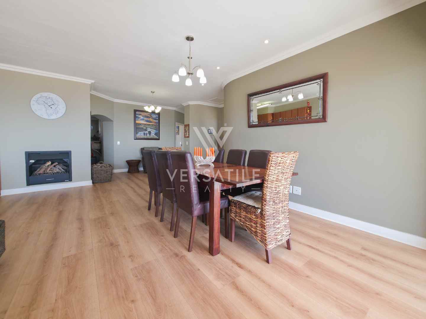 Open plan kitchen with scullery, lounge and dining area with Indoor fire place.