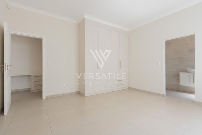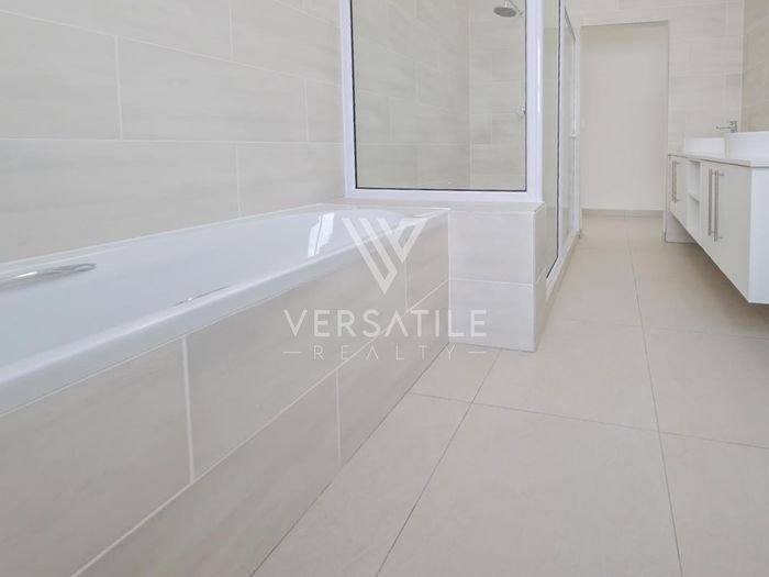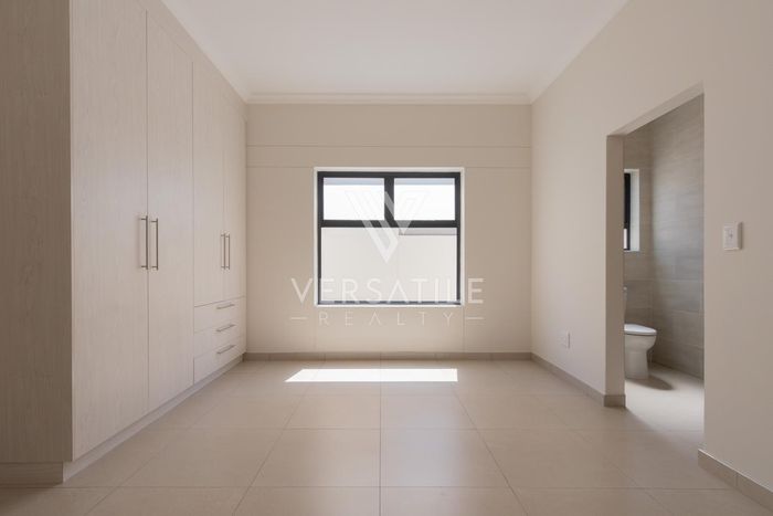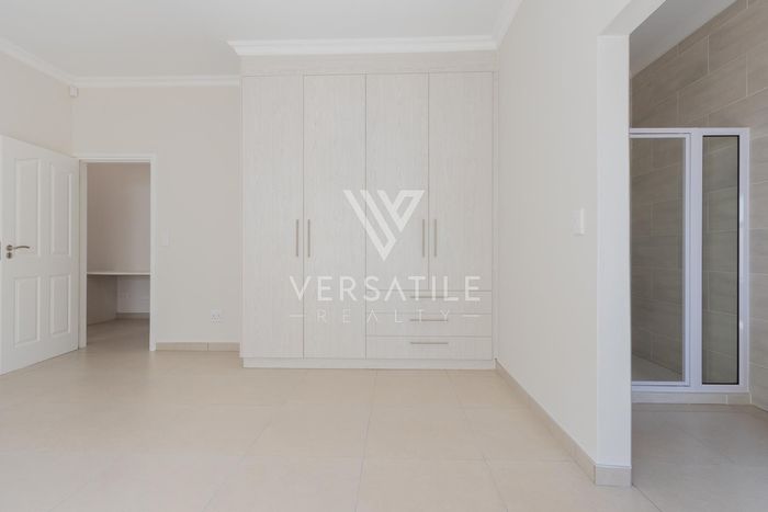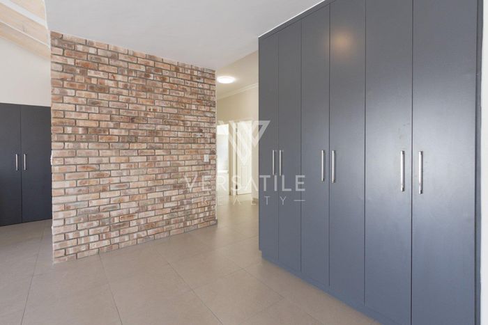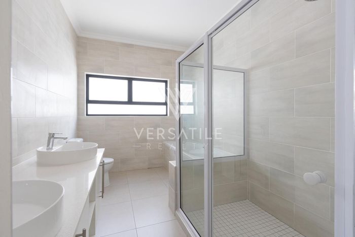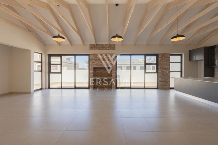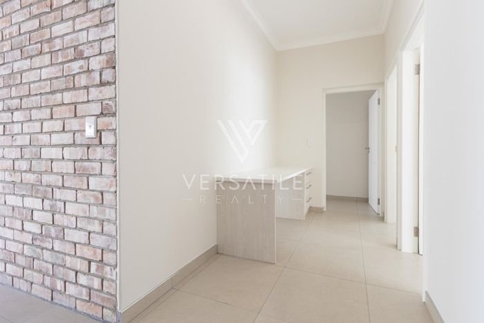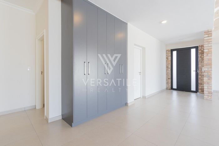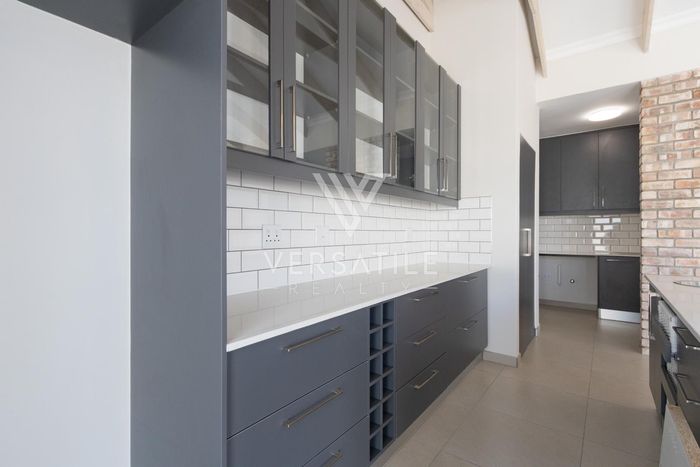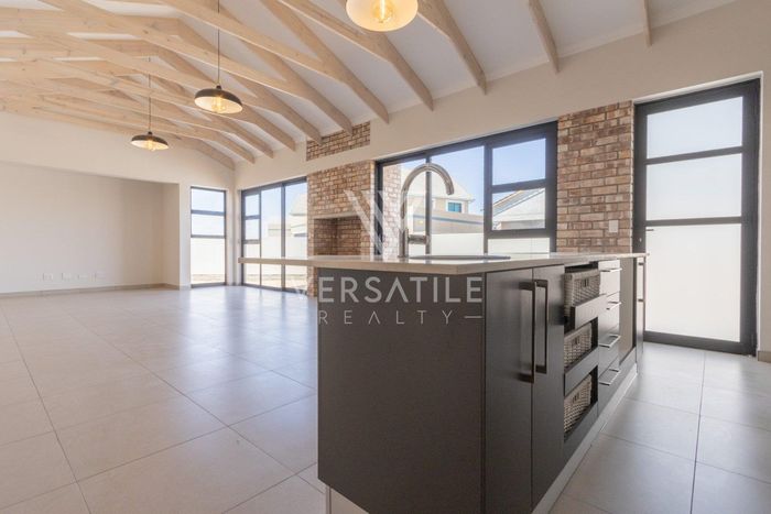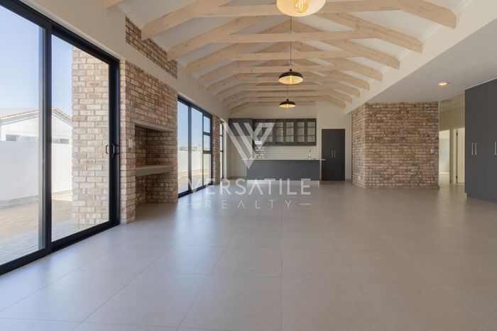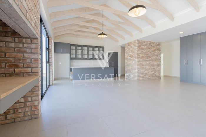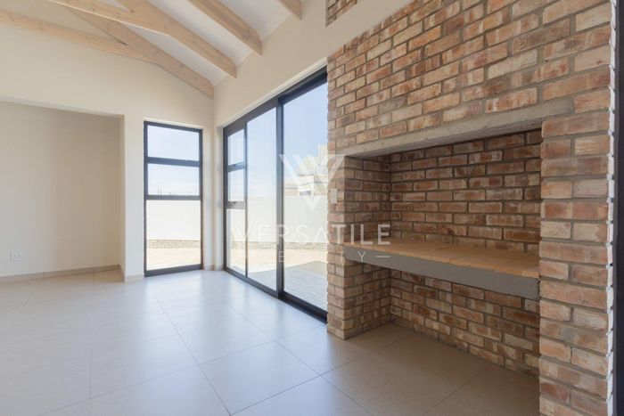 Contemporary family living in a peaceful neighbourhood, perfect for entertaining with an indoor braai and exposed trusses. Open-plan kitchen, study, three bedrooms, three and a half baths, double garage.